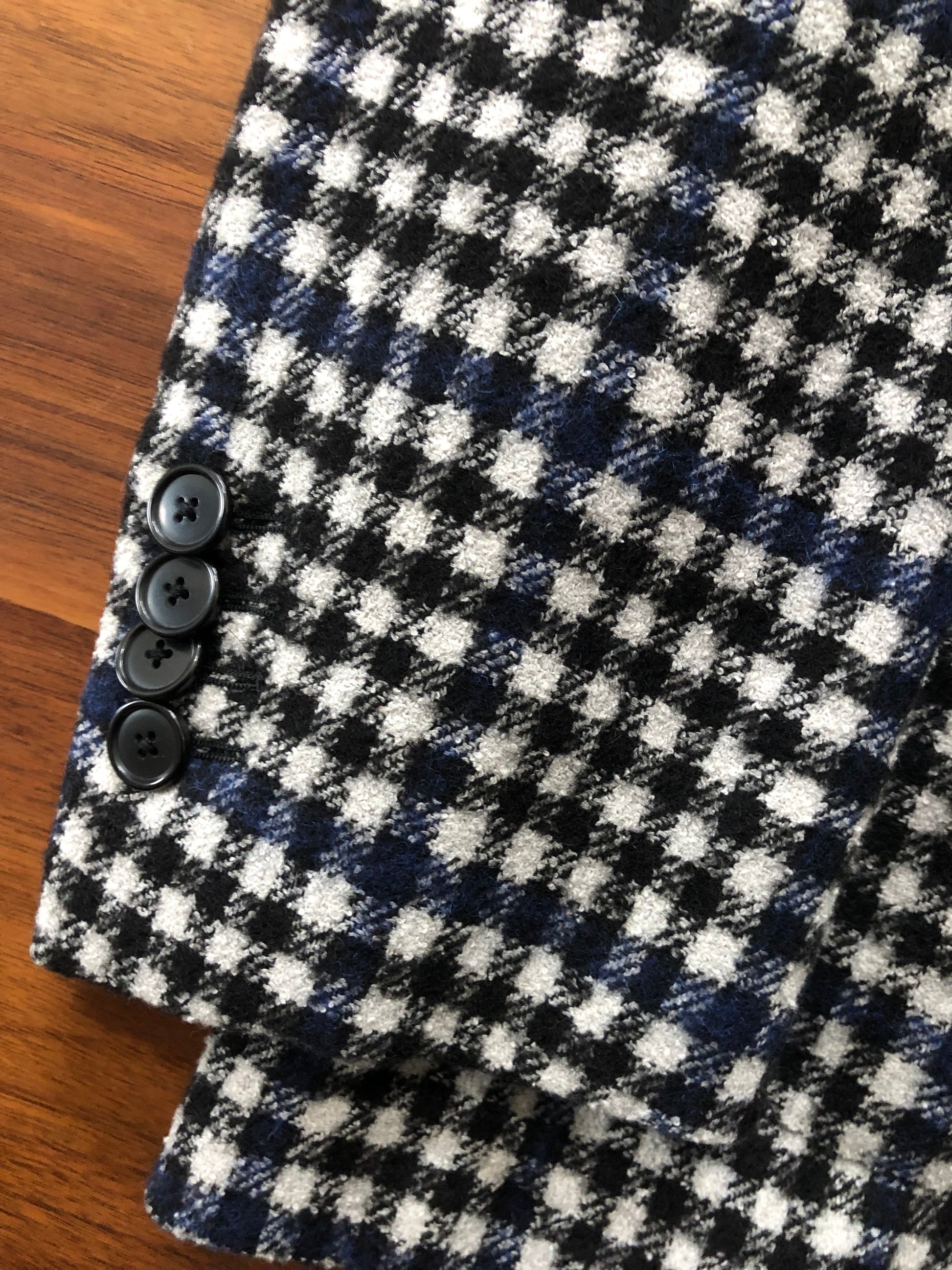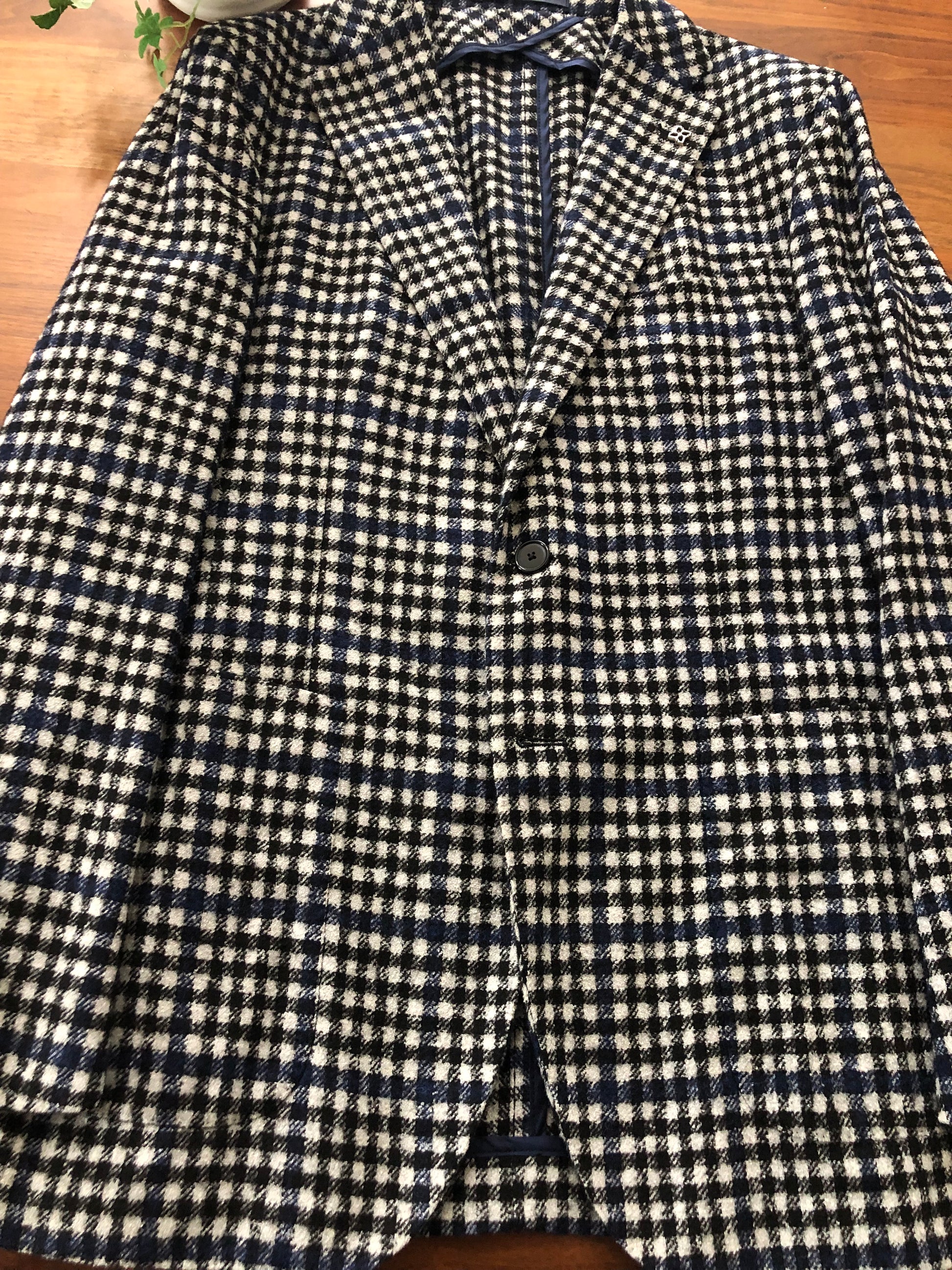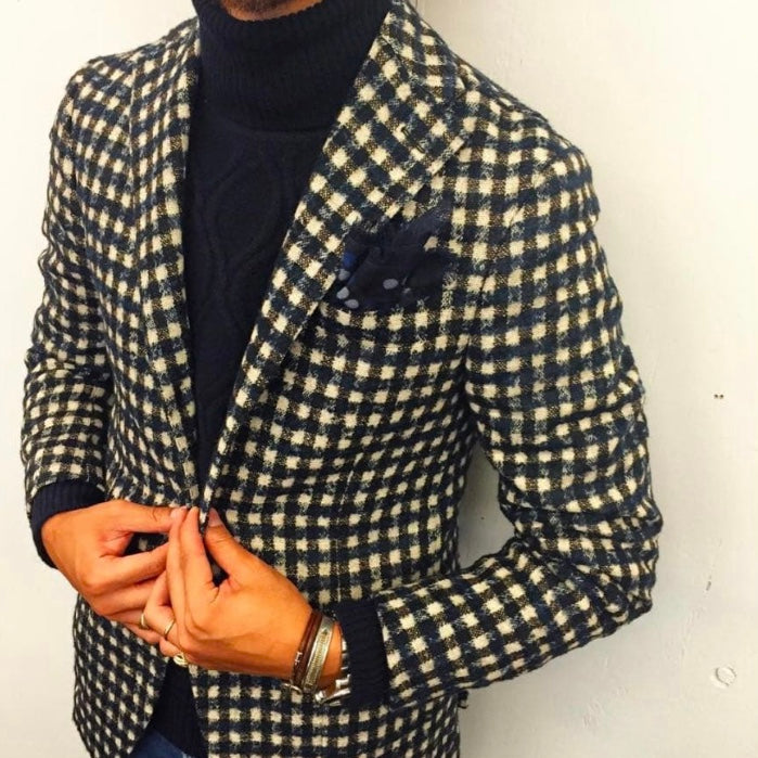 タリアトーレらしい大胆なセンスが光る、白・黒・ネイビーの配色がモダンな大柄チェックジャケット。表地にアルパカを贅沢にブレンドし、見た目にも伝わるふっくらとした肉厚な質感と、格別の暖かさを両立しています。圧倒的な存在感を放つ柄と、イタリア仕立てのシャープなシルエットが融合。羽織るだけで、周囲の視線を集める華やかさと洒脱さを同時に手に入れられる、特別な一着です。